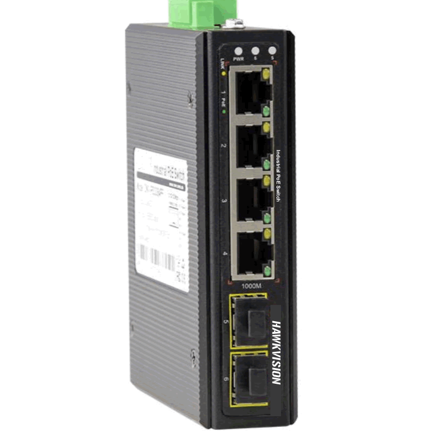 The HAWKVISION HK-IPS0402F is an unmanaged industrial PoE fiber switch designed for robust, high-density deployments. It features 4 × 10/100/1000M RJ45 PoE ports and 2 × 1000M uplink SFP fiber ports, with ports 1–4 supporting IEEE 802.3af/at PoE, delivering up to 30W per port.